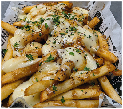 Crispy French fries topped with house made beef gravy, melted white cheddar cheese curds, and scallions.